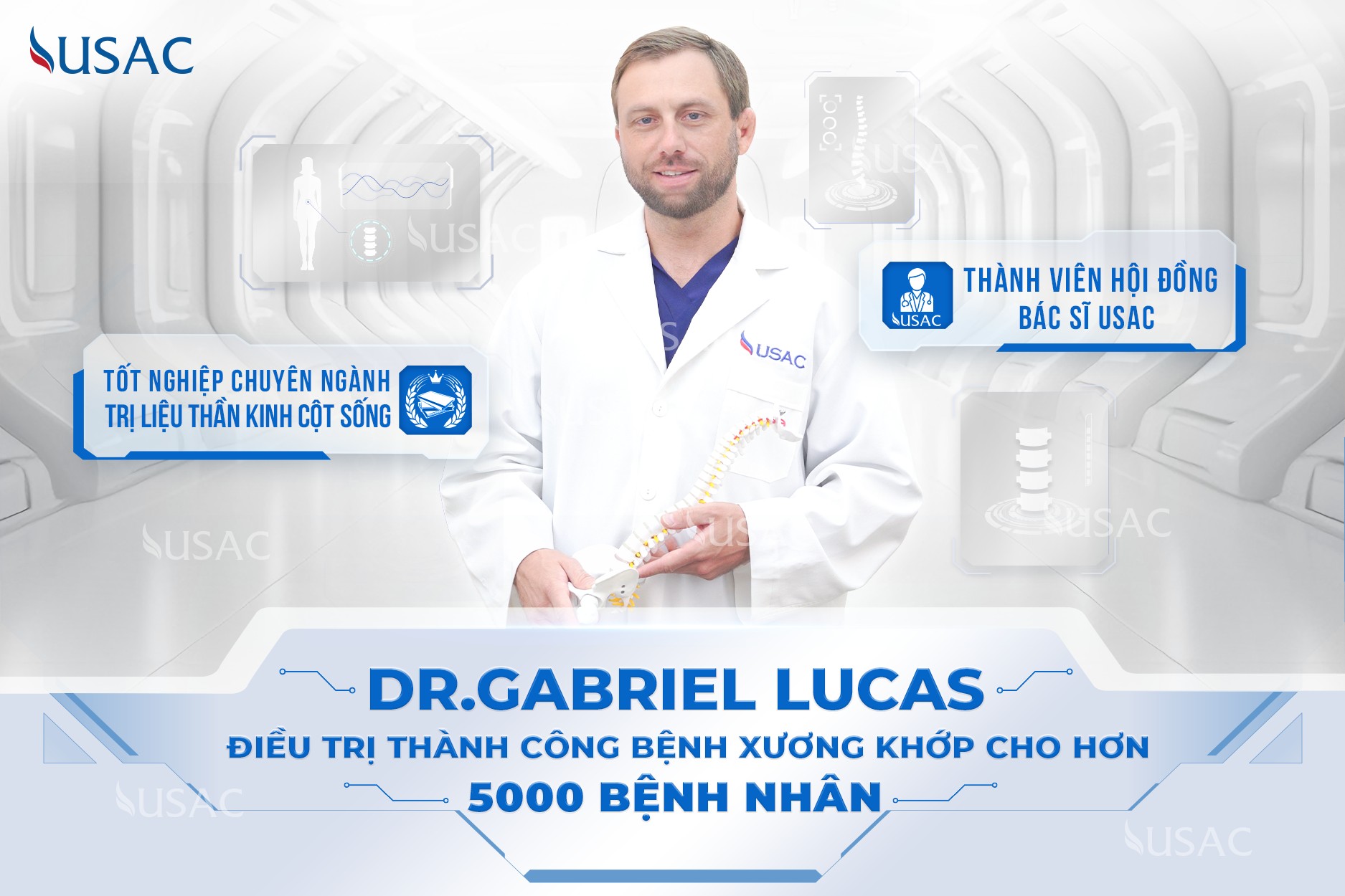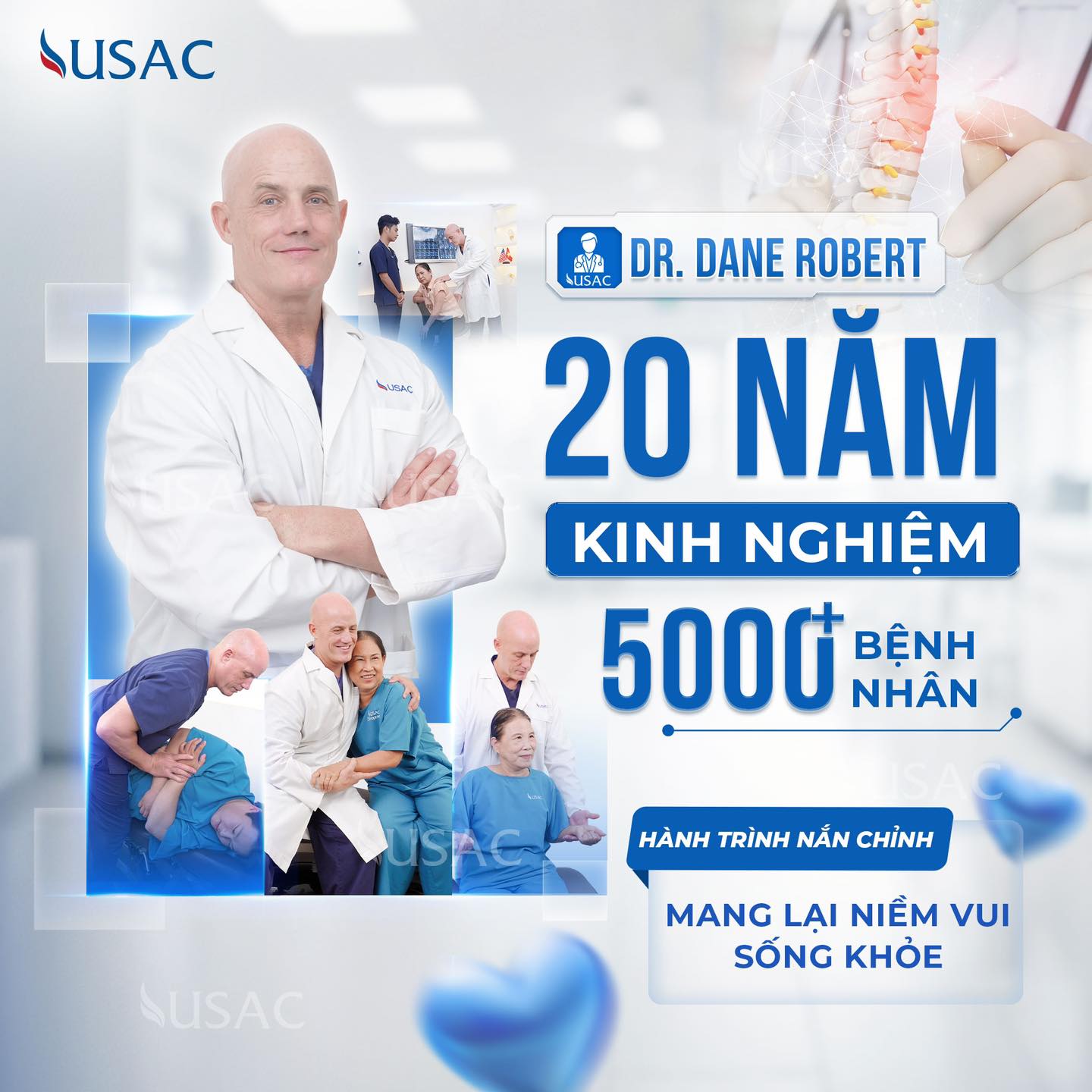 Là một trong những trung tâm điều trị cơ xương khớp chuẩn Mỹ hàng đầu tại Việt Nam, USAC không chỉ tự hào bởi sở hữu hệ thống phòng khám trải dài từ Bắc tới Nam với đầy đủ trang thiết bị hiện đại nhất, mà trên hết 100% bác sĩ tại USAC đều đến từ nước ngoài, các nước có nền Y học phát triển vượt bậc như Mỹ, Châu Âu, Nhật Bản. Đây chính là yếu tố giúp USAC trở nên vững tin và lớn mạnh trong lòng hàng trăm ngàn bệnh nhân.
