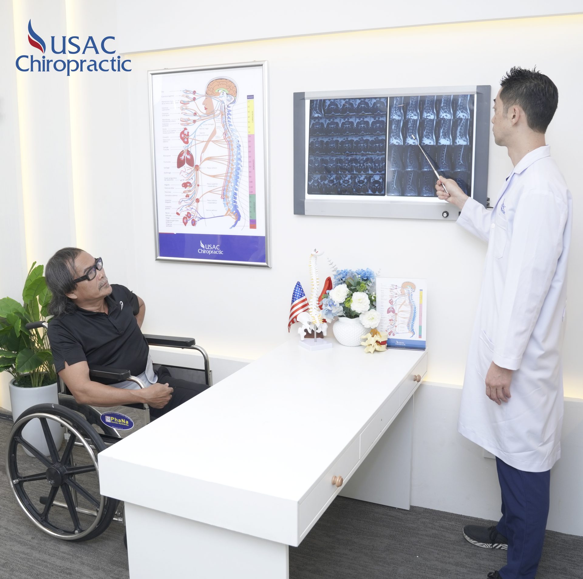 Vì vậy chú Dân đã trực tiếp đến USAC để tư vấn và điều trị, tại đây Dr. Kazuaki đã chỉ định 4 liệu pháp tối ưu là sự kết hợp giữa: Chiropractic nắn chỉnh đốt sống sai lệch về đúng vị trí, giảm chèn ép dây thần kinh, loại bỏ cơn đau tức thì; Physical Therapy; Trị liệu Công Nghệ Cao cùng Bài tập Therapeutics.